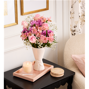 Pretty in pink, with touches of lavender, this arrangement is as inviting as a gentle breeze on a warm, sunny day. The white ceramic vase, crafted to resemble a flower wrap tied with a bow, adds to the timeless charm.